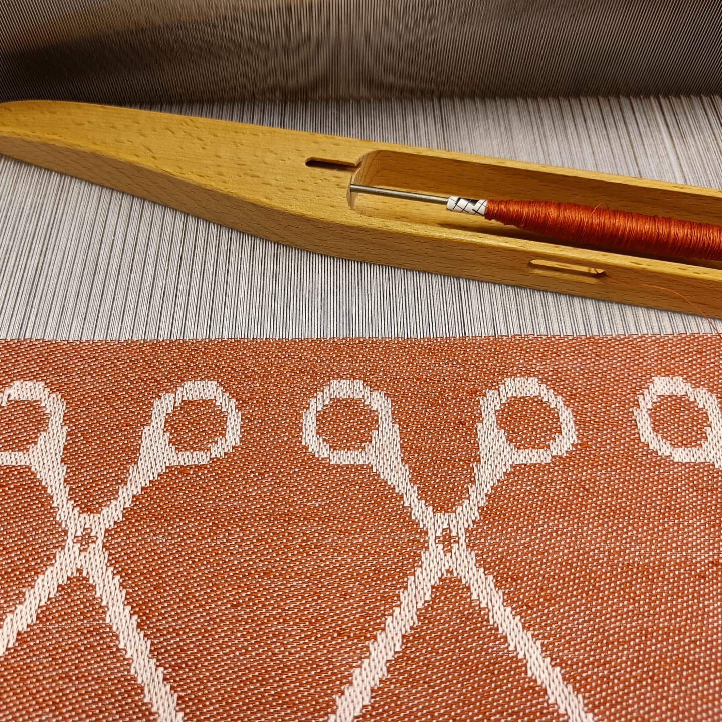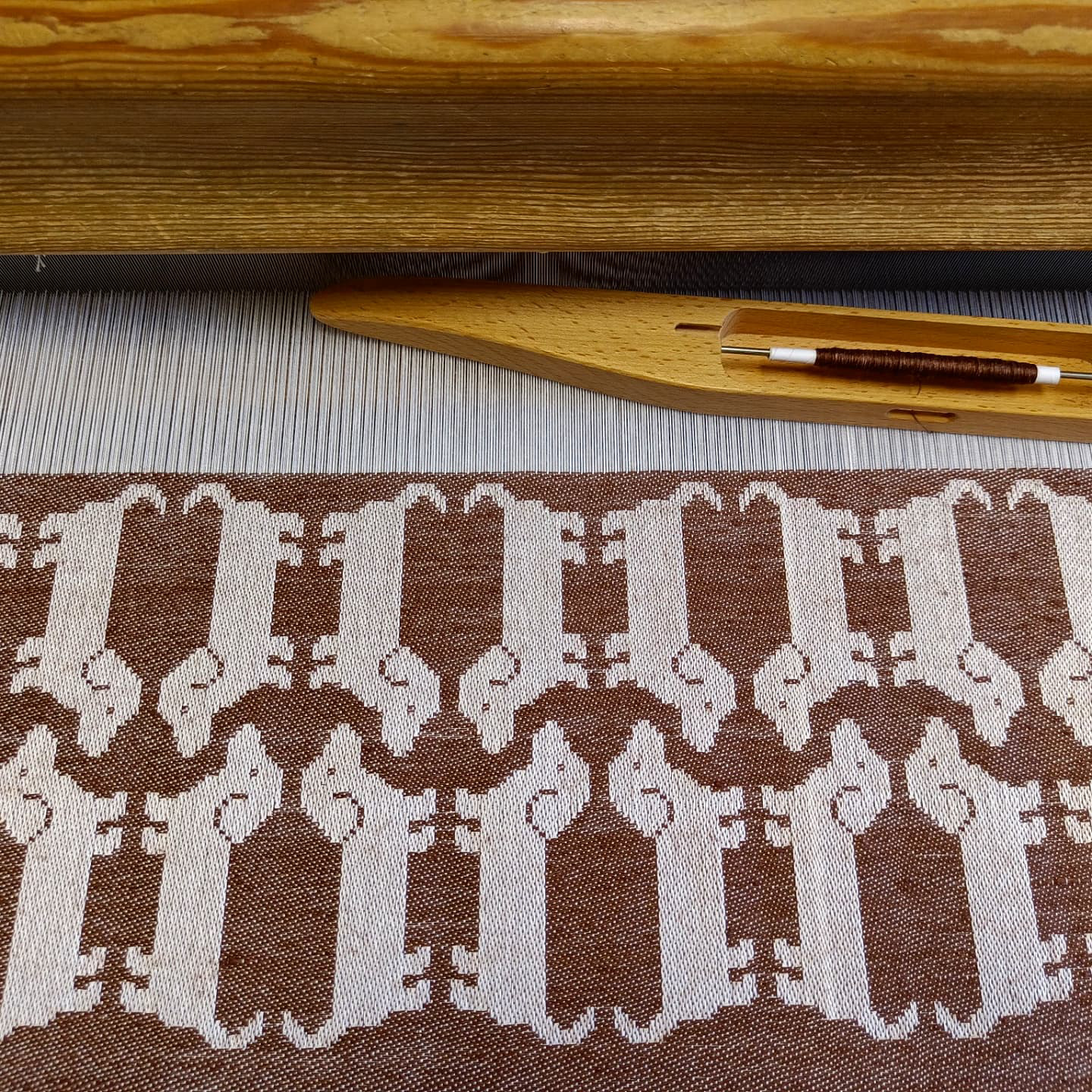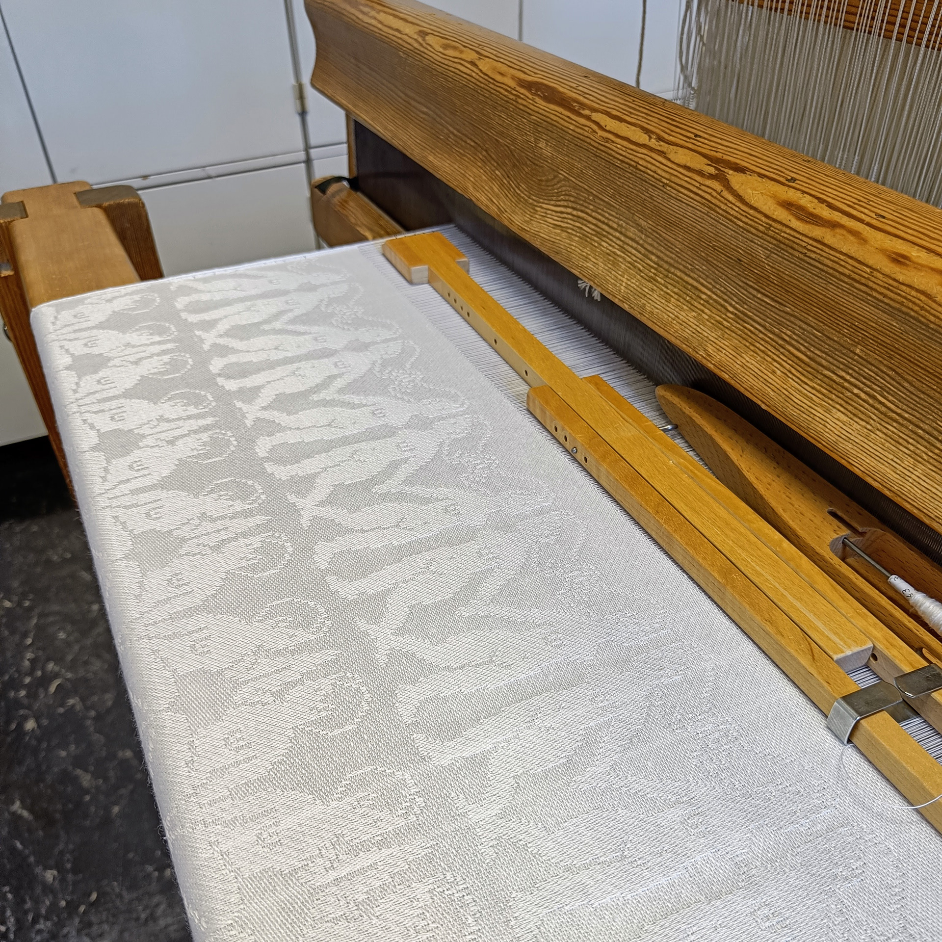 Damastvävning med dragrustning, egenritade mönster. Bomullsvarp och lininslag.