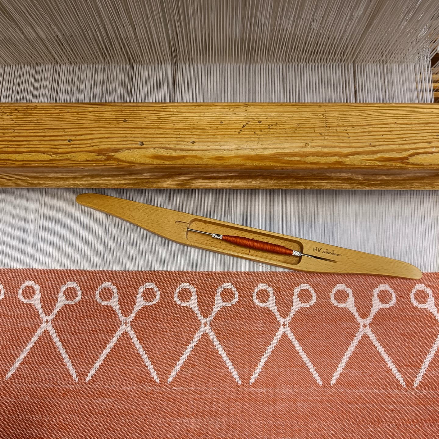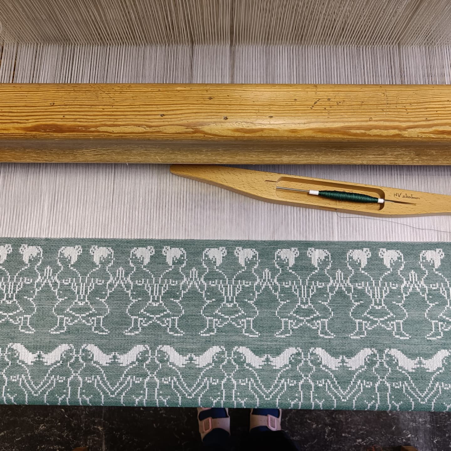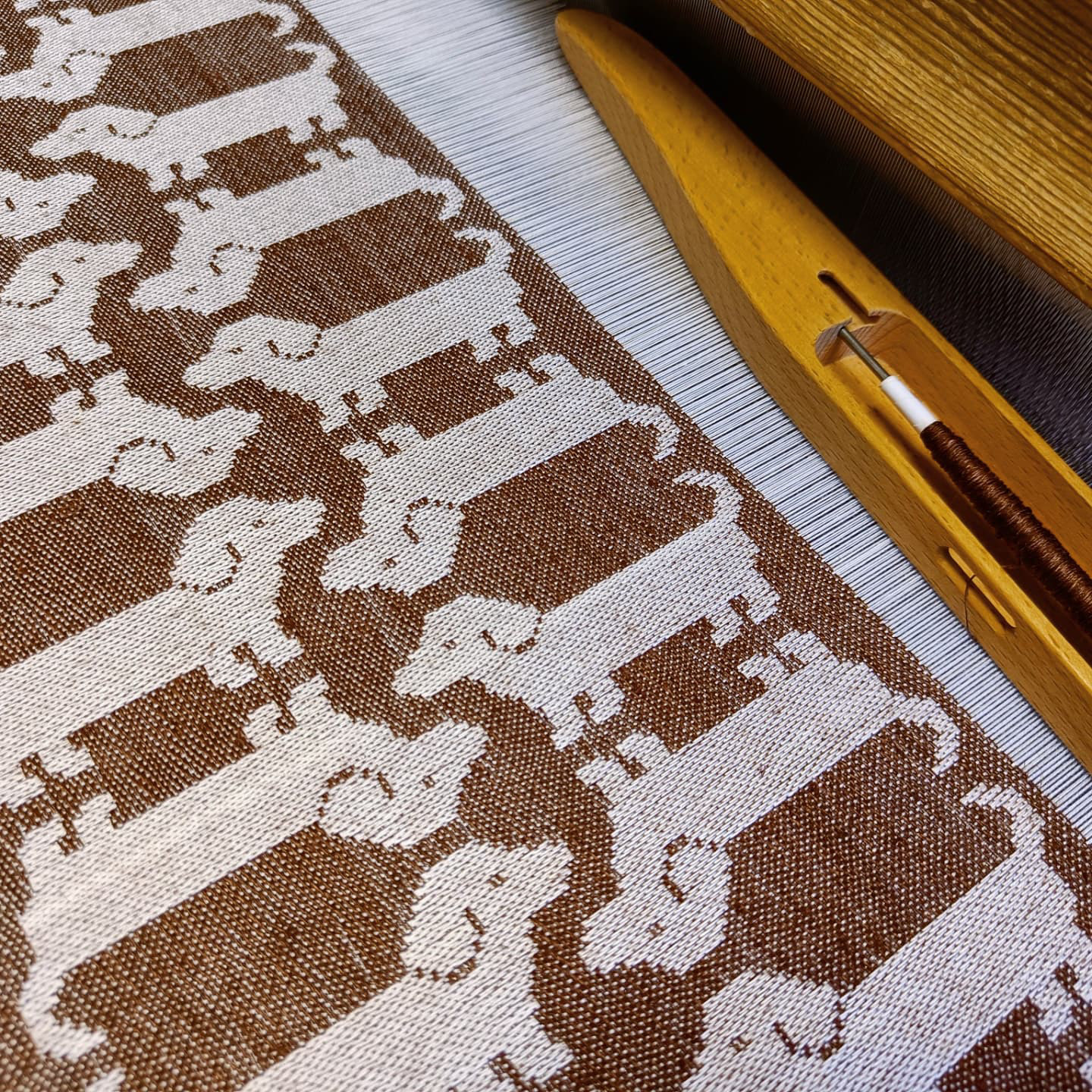 Damastvävning med dragrustning, egenritade mönster. Bomullsvarp och lininslag.