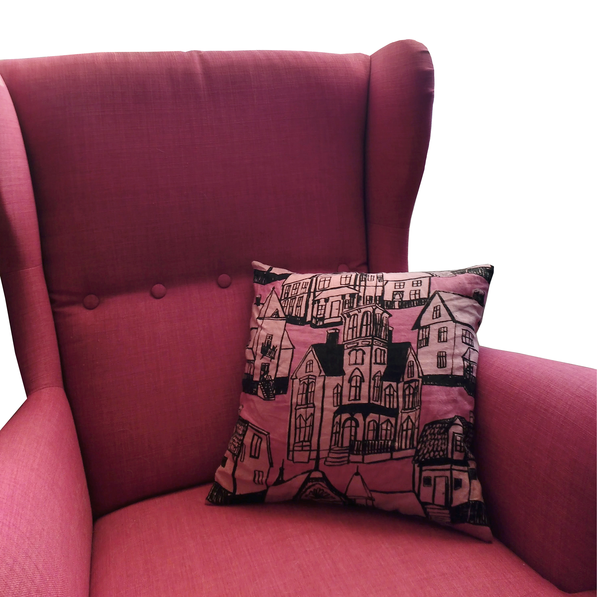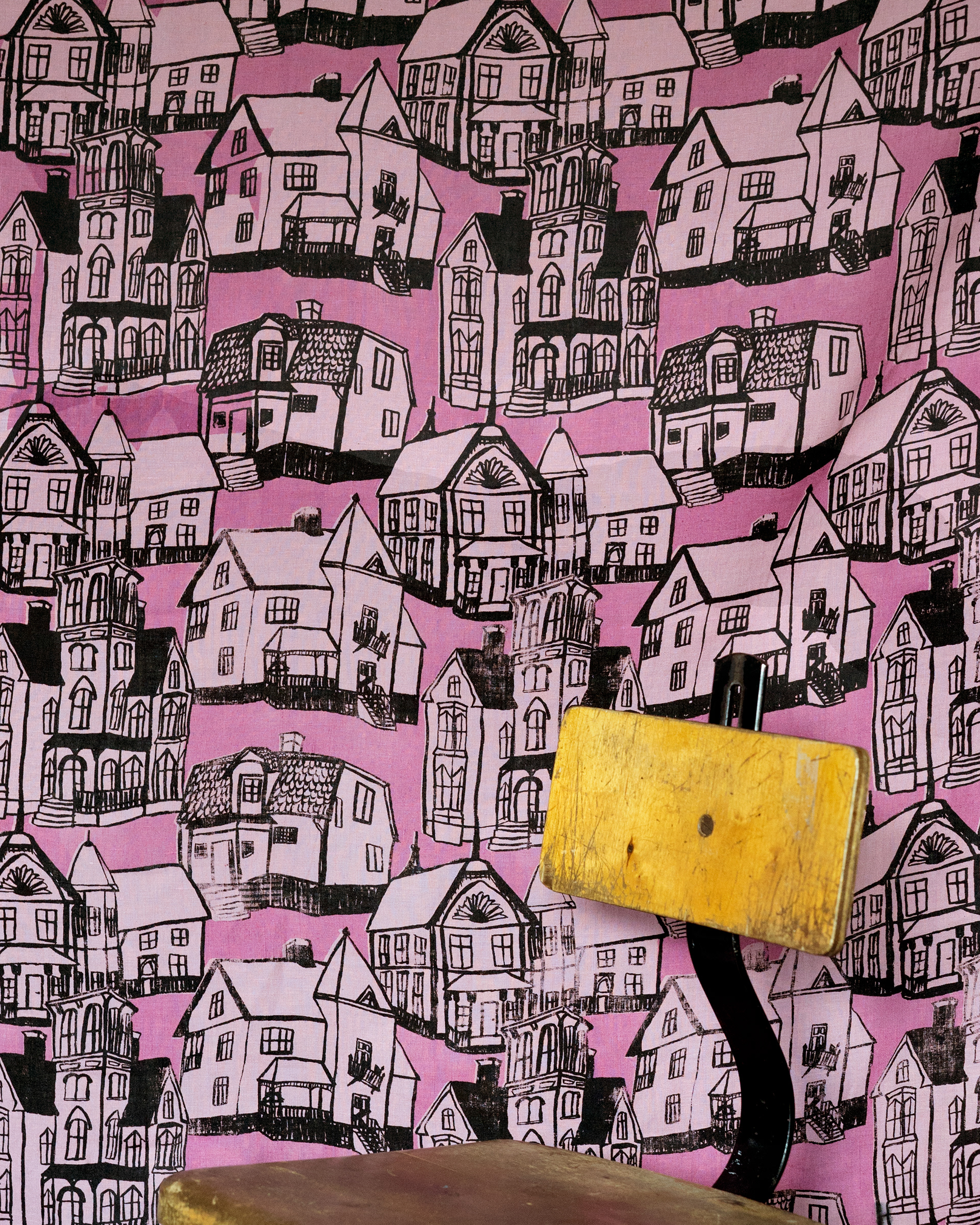 This project explored the possibilities of combining a surface pattern with a 3D-object, with inspiration from houses. Screenprinted fabric and 3D-object with laser cut shapes, both in linen, 2016